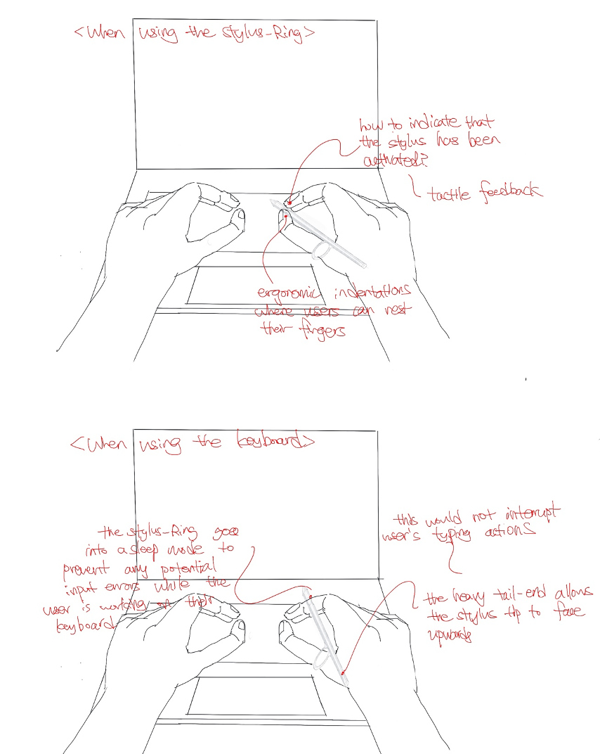 The Stylus-Ring is put on user’s thumb to allow users to quickly switch between different input devices without moving their arms. When users need to use the Stylus-Ring, they could grab its body to place their thumb and middle finger on the ergonomically designed indentations. This grabbing action will be detected by the inertial sensors since the tail end would be placed higher than the stylus tip when user grabs the stylus. From this sensor data, the Stylus-Ring infers that the user has resumed using the device. Then, it activates the device and sends a haptic feedback to user’s fingertips. This tactile signal would convey a sense of confirmation to the user that could lead to higher user satisfaction.